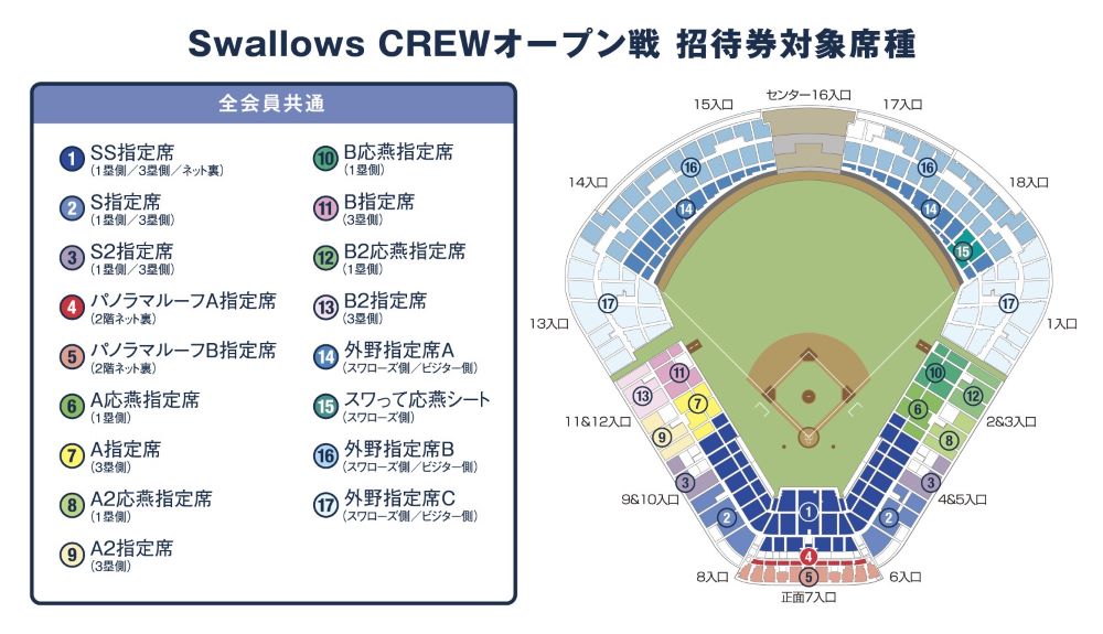 ※3月7日(月)以降にご入会いただいた方は、入会完了メール等入会が確認できるものをお持ちの上、オープン戦当日にSwallows CREW事務局にお越しください。その場で招待券をお渡しいたします