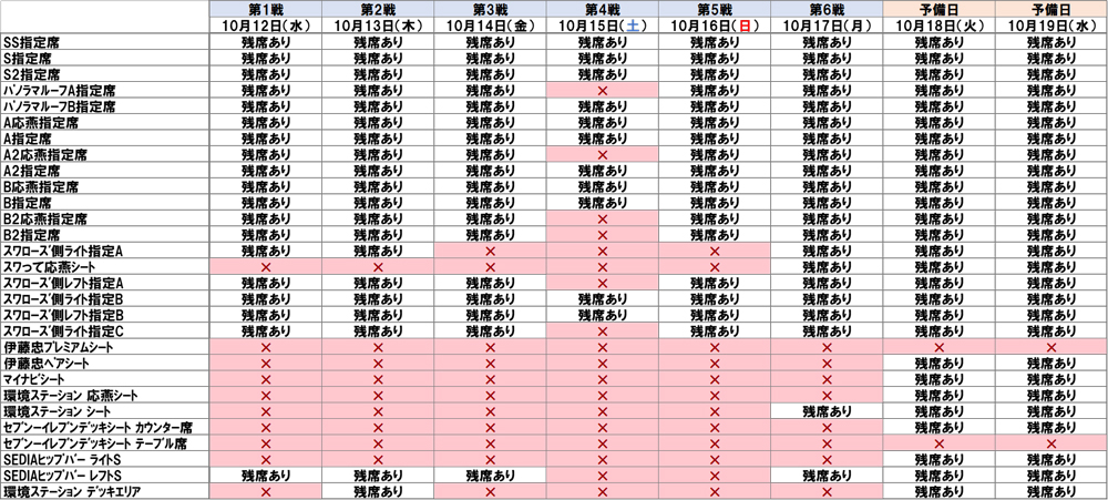 ※残席情報は、販売中に伴い、下記表と差異が生まれる可能性がありますので、ご了承ください