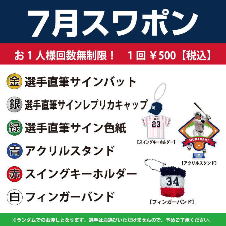 7月19日(金)から行われる横浜DeNAベイスターズ3連戦に合わせて、500円スワポン抽選会をOfficial Goods Shop神宮球場店とOfficial Net Shopにて開催します。今回も景品をたくさん準備しましたので、この機会にぜひご参加ください!