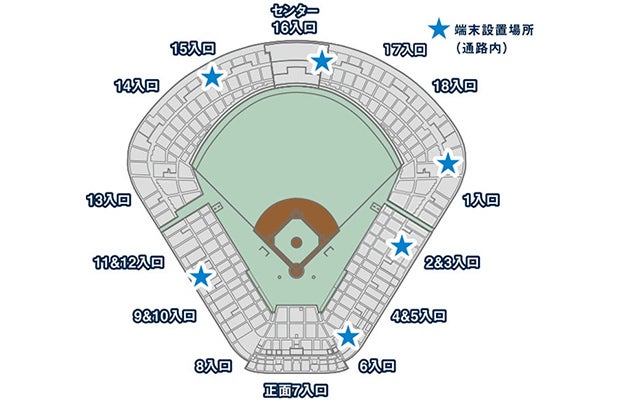 球場内6カ所に設置されている来場登録端末に会員証またはデジタル会員証をかざしてご登録ください。