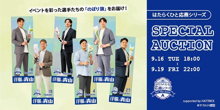 7月8日(火)・9日(水)に開催した「はたらくひと応燕シリーズ supported by 洋服の青山」で掲出したのぼりに、選手の直筆サインと感謝のメッセージを添えた特別なのぼりを、オークションに出品いたします。