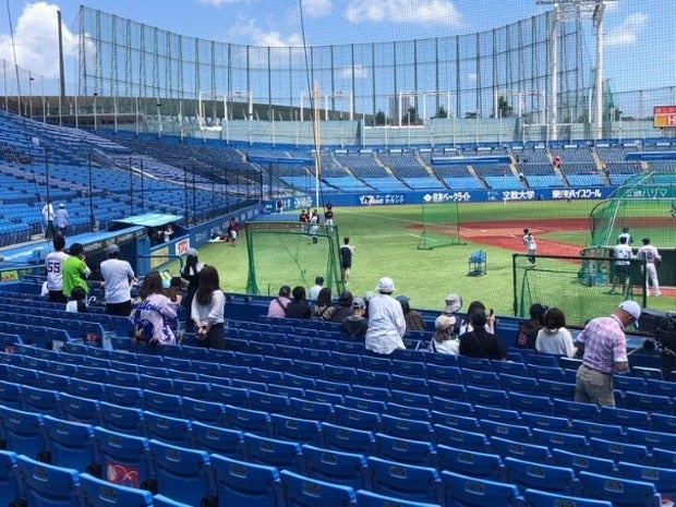 打撃練習見学は神宮球場1塁側スタンドにて、投手練習見学はコブシ球場(明治神宮外苑軟式グラウンド)にて、ご覧いただけます。