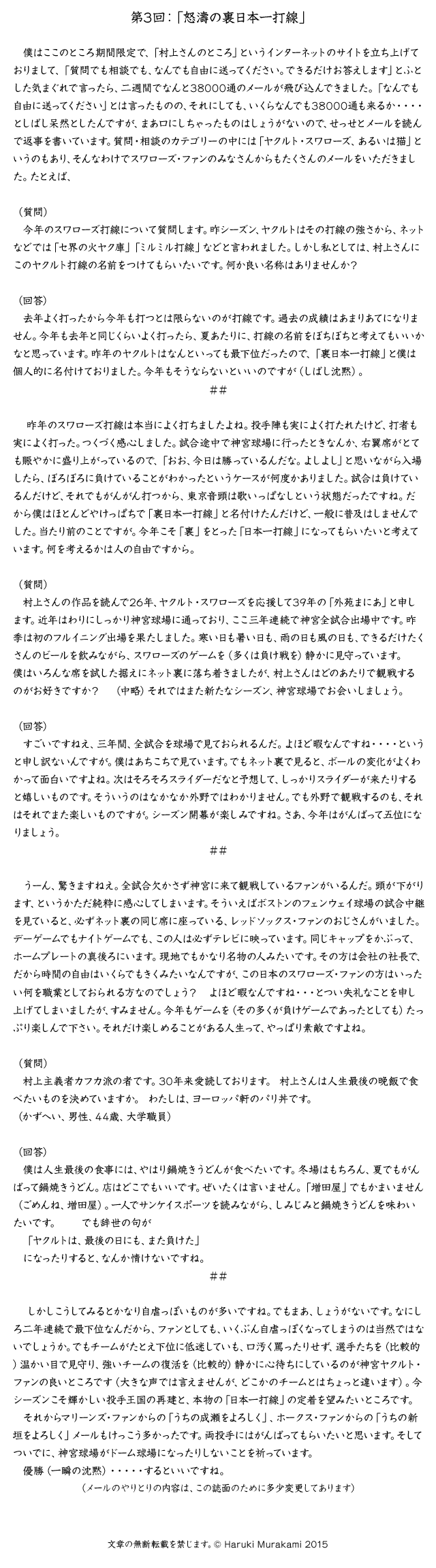 1979年小説家デビュー、『風の歌を聴け』で第23回群像新人賞を受賞。