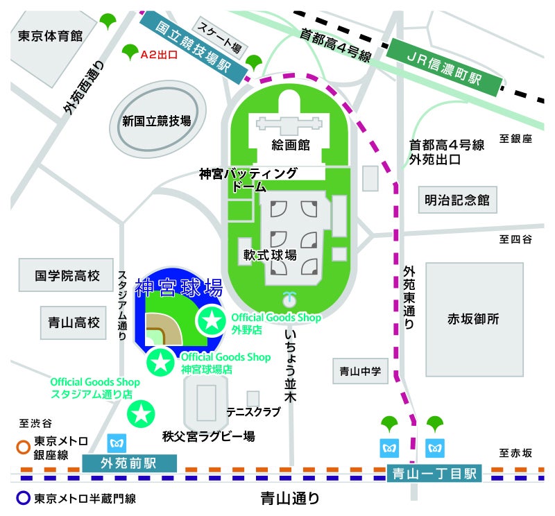 店舗紹介東京メトロ銀座線外苑前駅から神宮球場へとつながるスタジアム通りにある初の球団直営店舗です。