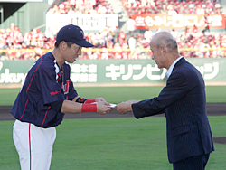 26日(火)マツダスタジアムで行われた広島戦の試合前に森岡選手会長より贈呈いたしました。