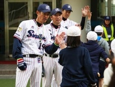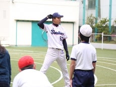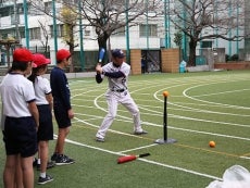 15日(金)、元選手で現球団職員の山部太氏、河端龍氏、徳山武陽氏が東京都港区立青山小学校を訪問。児童たちへボールの打ち方、捕り方の指導を行いました。