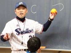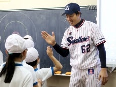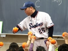 23日(金)、元選手で現球団職員の河端龍氏と徳山武陽氏が東京都文京区立汐見小学校を訪問。毎年春ごろに行われる「スポーツテスト」に向けて、正しいボールの投げ方を指導しました。