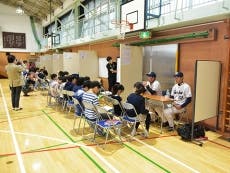 体育館に各職業ごとにブースが用意され、児童たちは自分が興味のある職業についてインタビュー形式で話を聞きます。各ブース1セット20分を3回繰り返し、河端氏と徳山氏のブースには合計13名の児童が集まりました。自己紹介の後、代表の児童が「今日は僕たちのために来ていただきありがとうございます。今日の話を将来のために活かしていきたいと思います」と挨拶しインタビューがスタート。子供たちからは、現役時代や現在の仕事、少年時代のことなど、様々な質問が寄せられました。