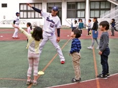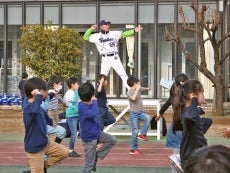 16日(土)、元選手で現・球団職員の河端龍氏と徳山武陽氏が東京都港区にある区立高輪台小学校を訪問。毎年春ごろに行われる「スポーツテスト」に向けて、児童たちへ正しいボールの投げ方を指導しました。