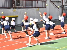 まずは準備運動を行ったあと、ボールを持って、体の周りで回したり、上に投げてボールに慣れていきます。続いて、投げる動作を3段階に分けて説明し、2人1組になってキャッチボールを開始。河端氏は「ボールを持っていない方の手を矢印に見立てて、投げる方向へ向けよう」とアドバイスを送ると、子どもたちはキャッチボールが上達していきます。