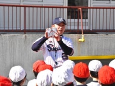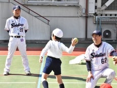 20日(水)、元選手で現・球団職員の河端龍氏と徳山武陽氏が東京都港区にある区立白金小学校を訪問。毎年春ごろに行われる「スポーツテスト」に向けて、児童たちへ正しいボールの投げ方を指導しました。