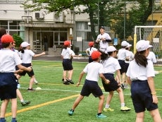続いて、柔らかいボールを使うと徳山氏は「縫い目に沿って持つと、力強く投げることができるよ」と持ち方について説明。その後は2人1組になってキャッチボールを行っていきます。慣れてくるとカニステップで助走をつけてボールを遠くに投げる練習を行い、遠投にもチャレンジをします。
