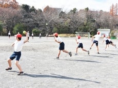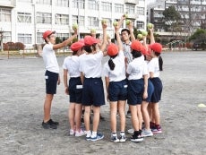遠投の後は、2チームに分かれて投げた距離で得点を競うゲームを実施。チームで作戦会議を行うと、元気よく気合を入れます。友達にアドバイスを送ったり応援したり、チームで協力をして盛り上がりました。そして授業後は、子供たちへ投げ方名人認定書を贈呈し、ハイタッチをしてお別れをしました。