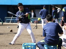 歓迎式を終えると、選手たちは室内練習場へ移動し、練習を開始。全体でのウォーミングアップ、コンディショニングを終えると、投手陣はキャッチボール、バントシフト、ブルペンでの投球などを行います。一方の野手陣はキャッチボール、ノックを行うと、エスコバー選手、青木選手、雄平選手、坂口選手がランチ特打を実施。午後は8箇所に分かれて行うローテーションのバッティング練習、個別練習やウエイトトレーニングで調整しました。