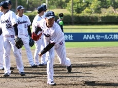 3日(月)、ANA BALL PARK 浦添 (浦添市民球場)での春季キャンプ第1クール3日目。練習前には浦添市から差し入れの贈呈式が行われ、アグー豚やスパム缶、オリオンビール製品、アイスクリームなど地元特産品が贈られました。高津監督は「たくさんの差し入れ、本当にありがとうございます。しっかりと残りのキャンプ頑張ってまいります」と感謝の気持ちを述べました。