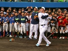 最後にロングティーのお手本として、濱田選手、山崎選手が登場。山崎選手が柵越えを放つと、子供たちからは大きな歓声が上がっていました。子供たちから「今日習ったことを活かして良いプレーが出来るように頑張ります」とお礼の言葉をいただき、野球教室を終えました。