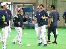 13日(木)、ANA BALL PARK 浦添 (浦添市民球場)での春季キャンプ第3クール最終日。室内練習場でのウォーミングアップを終えると、投手と野手が分かれてキャッチボールを行います。その後、投手と野手が合流し、シートノック、シートバッティングを実施。シートバッティングに参加しなかった高梨投手、寺島投手、石川投手らがブルペンで調整しました。また、吉田投手、梅野投手、五十嵐投手が打撃投手を務めています。