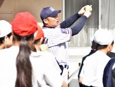 19日(水)、元選手で現・球団職員の河端龍氏と三輪正義氏が東京都渋谷区にある区立渋谷本町学園を訪問。毎年春ごろに行われる「スポーツテスト」に向けて、子供たちへ正しいボールの投げ方を指導しました。