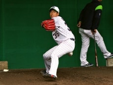 午後1時からは東北楽天との練習試合を実施。先発の高橋投手は初回、先頭・小深田選手の三塁打と2つの四球で二死満塁のピンチを招くと、押し出しの四球を与え、先制を許します。打線はその裏、一死からエスコバー選手、山田選手が四球を選び出塁すると、雄平選手、西田選手、濱田選手の連続タイムリーなどで4点を奪い、逆転に成功。続く2回、高橋投手は先頭の下妻選手にレフトへソロホームランを浴び、2点目を失います。3回からは2番手・クック投手が登板しますが、2回を投げ5失点。その後も3番手・イノーア投手が6回に1失点、5番手・梅野投手が8回に4失点と、投手陣が崩れ、4対12で敗戦しました。