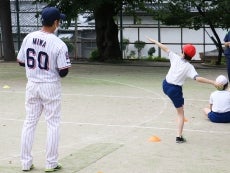 17日に訪問した文京区立駒本小学校では、三輪氏が「野球が苦手な子もいるかもしれないけど、苦手なことにも頑張ってチャレンジしよう!」と呼びかけ、授業がスタート。準備体操を終えると、正しいボールの持ち方と投げ方、二人一組になってのキャッチボール、遠投のコツなどを伝えました。