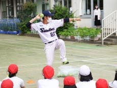 ヤクルト球団では、社会貢献活動の一環として、小学校での投げ方教室を実施。近年、小学生の投力低下が指摘されるなか、選手OBが東京都内の小学校で正しいボールの投げ方や遠投力を指導しています。