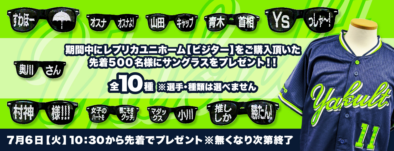 2021年7月6日(火)よりOfficial Net Shop・Official Goods Shopにて、レプリカユニホーム(ビジター)をお買い上げのお客様先着500名様にシークレットサングラスをプレゼントいたします。またビジターデザインにちなんだユニホームベアや人気ガチャの必勝守り(ビジターバージョン)の販売も行います。
