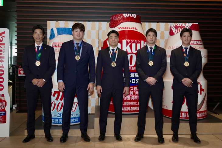城石コーチ、中村選手、山田選手、高橋選手、村上選手がヤクルト本社を訪れ、WBC優勝を報告