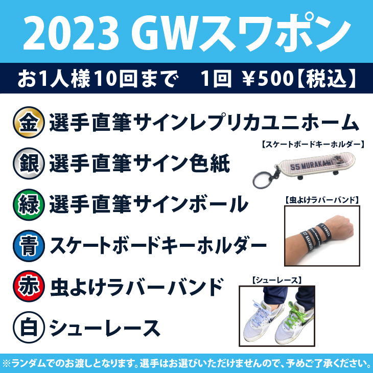 5月5日(金)より、500円スワポン抽選会をOfficial Goods Shop神宮球場店とOfficial Net Shopにて開催します。今回はお出かけとともにスワローズを感じていただける景品を3つ準備しました!この機会にぜひご参加ください!