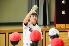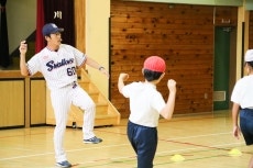 ヤクルト球団では、社会貢献活動の一環として、小学校での投げ方教室を実施。近年、小学生の投力低下が指摘されるなか、選手OBが東京都内の小学校で正しいボールの投げ方や遠投力を指導しています。