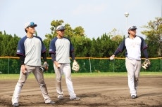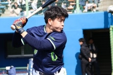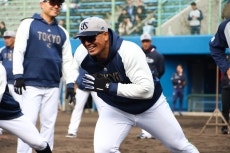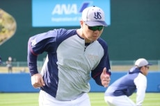 室内練習場でのストレッチを終えると、メイン球場にてウォーミングアップを行います。その後、投手野手に分かれてキャッチボール、ノックなどのメニューを消化。その後、投内連携、バントシフトなどの練習を実施。この日は、丸山和郁選手、西村選手、濱田選手、増田選手、伊藤選手が特打を行い、特守には赤羽選手、武岡選手、橋本選手、並木選手、澤井選手、岩田選手、丸山和郁選手、濱田選手が参加。ブルペンには星投手、田口投手、高橋投手、そしてルーキーの荘司投手が入っています。