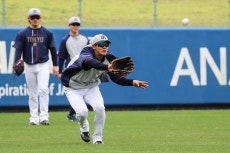 室内練習場でのストレッチ、ウォーミングアップを終えると、野手陣はスパイクチェック、キャッチボール、シートノック、投手陣はキャッチボール、各塁などのメニューを消化。その後、投手、野手でバントシフトの確認を行うと、投手はブルペンへ。この日は、清水投手、奥川投手、石川投手、小川投手ら8名の投手がブルペンに入ります。メイン球場では、野手陣がバッティング練習を実施。