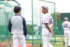 練習前には池山監督が「対話、元気、笑顔。この3つをテーマに頑張りたいと思います。髙津監督から監督のバトンを渡してもらいました。私は一生懸命走るだけです」と、選手、スタッフの前に立って訓示しました。