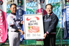 3日(月・祝)、松山中央公園野球場(坊っちゃんスタジアム)での秋季キャンプ3日目。練習前には、東京ヤクルトスワローズ松山市協力会より、陣中見舞いが送られました。