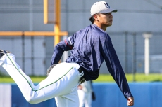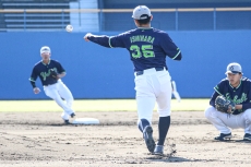 全体でのウォーミングアップ、スプリントを終えると、投手陣はキャッチボール、牽制練習などを行います。一方の野手陣はキャッチボール、シートノックとメニューを消化。その後、投手と野手合同の投内連携とピックオフを実施。投手陣からは中村優斗投手、下川投手、石原投手、翔聖投手が参加。投手と野手でコミュニケーションをとりながら、緊張感のある練習が行われました。その後、野手は2ヶ所バッティング、投手はティーバッティング、コンディショニングと午前のメニューを消化しました。