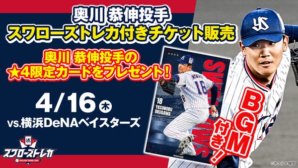 当日は奥川恭伸投手の誕生日!この日だけの★4限定スワローズトレカ(BGM付)が付いた、特別なチケットです。