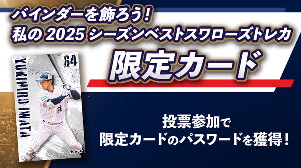 ③投票参加特典の限定カード受け取りには、投票完了画面で表示されるパスワードが必要です。スワローズトレカ上のデジタルカードとなり、紙カードのプレゼントではございません