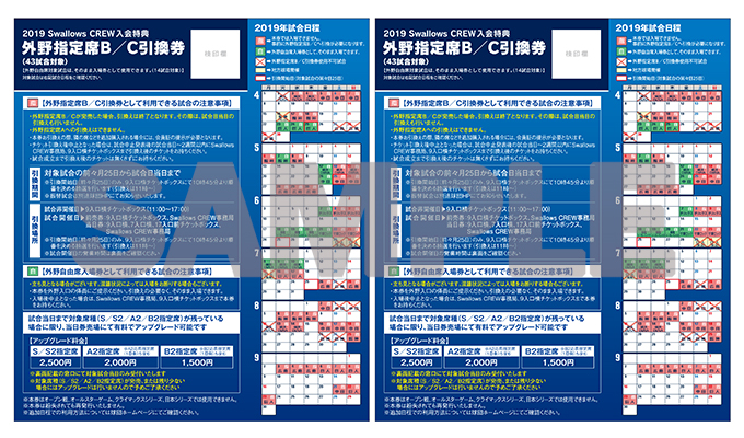 - 2019年神宮球場開催オープン戦初戦以降にSwallows CREW事務局窓口にてお申し込みの方は、その場で記念品・会員証等をお渡しいたします