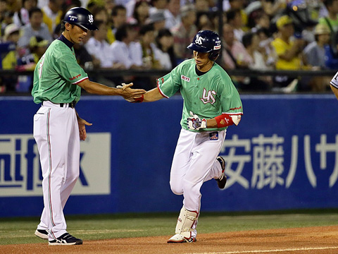 追い上げる18号2ラン 山田選手は10点のリードを許した4回、「風が大きかったと思う」とメッセンジャー投手から右中間スタンドへ18号2ランを突き刺しました! また3回の第2打席では、ライトへリーグトップを独走する30本目の二塁打も放っています。 2014 8/5
