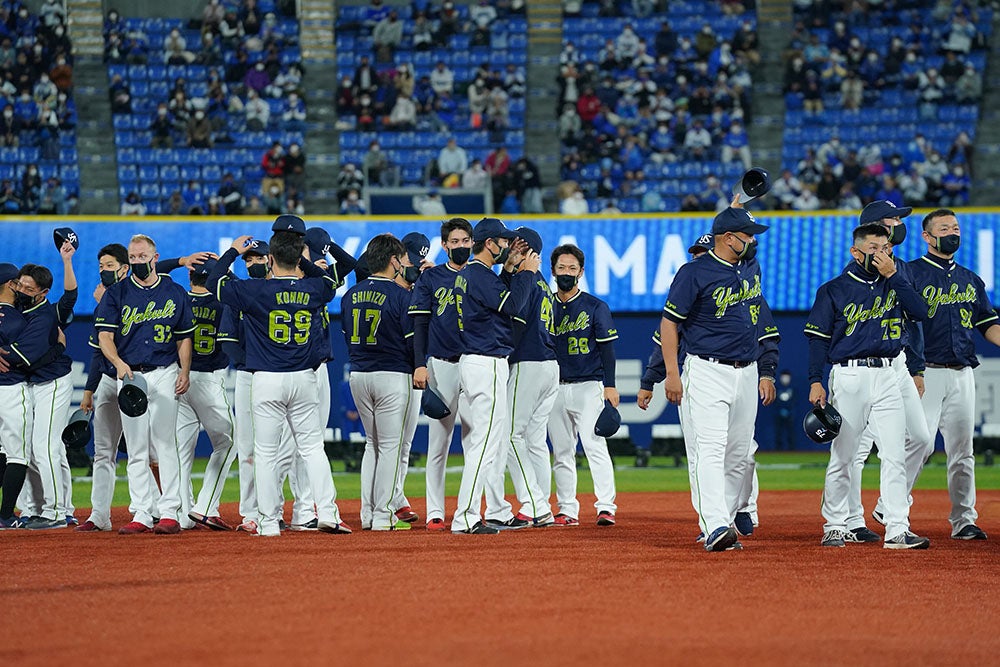 26日(火)、横浜スタジアムでの横浜DeNAベイスターズ戦。4点リードの9回、6番手・マクガフ投手がマウンドへ。柴田選手に安打、桑原選手に四球を与えるなど、二死二、三塁のピンチを招きますが、最後は佐野選手をファウルフライに打ち取り、試合終了!3回にサンタナ選手が決勝の2点タイムリーを放つなど、集中打で4点を奪う猛攻を見せると、6投手による継投!最後は守護神・マクガフ投手が無失点に抑え、5対1で勝利!6年ぶり8度目のリーグ優勝を決めました!