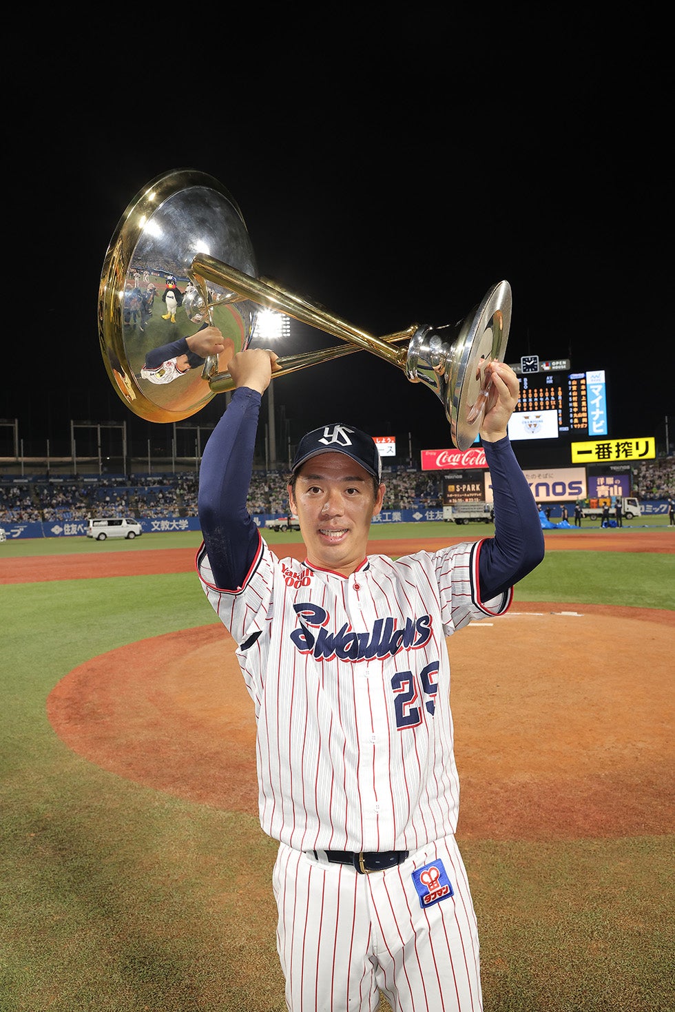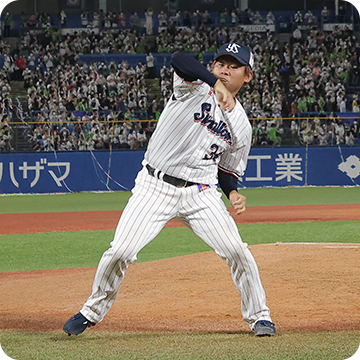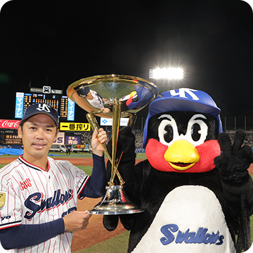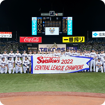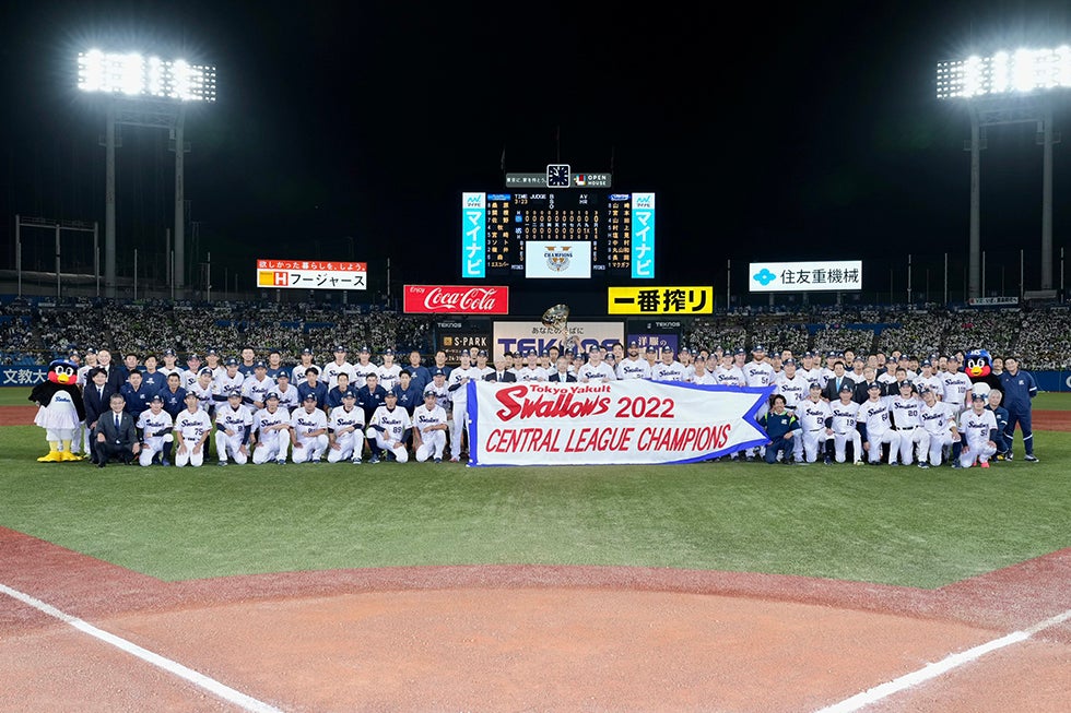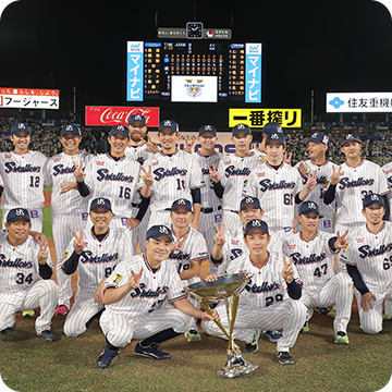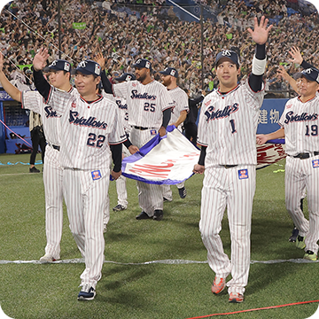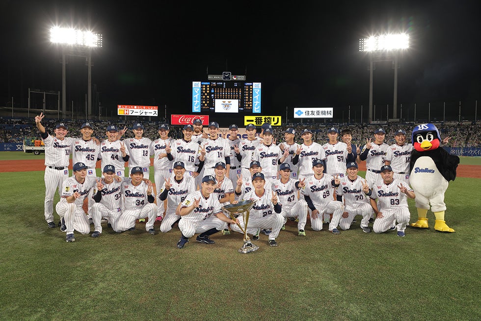 9月25日(日)、神宮球場での横浜DeNAベイスターズ戦。先発・小川投手が6回2安打無失点の好投を見せると、7回からは石山投手、清水投手、マクガフ投手の継投で無失点に封じます。0対0の9回裏、一死二塁から途中出場の丸山和選手が決勝タイムリーを放ち、1対0でサヨナラ勝ち!2年連続9回目のJERAセントラル・リーグ優勝を決めました!
