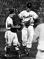 石戸四六投手、対広島27回戦(川崎)で完投勝ち、金田正一投手に次ぐ2人目の20勝投手になる。