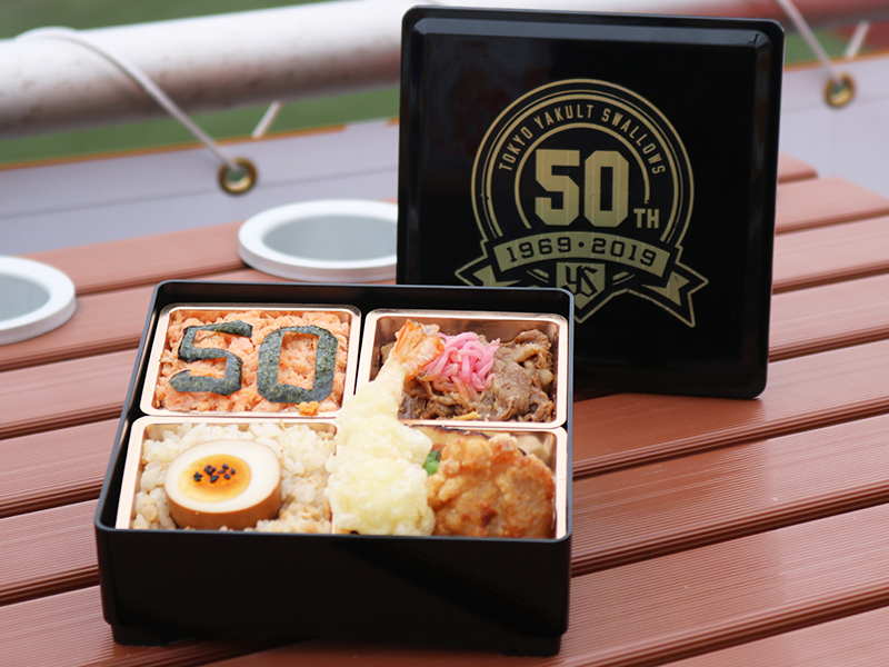 | 内容 | ヤクルト球団設立50周年を記念したお弁当です。お弁当箱は食べ終わった後に、再利用できます。 |