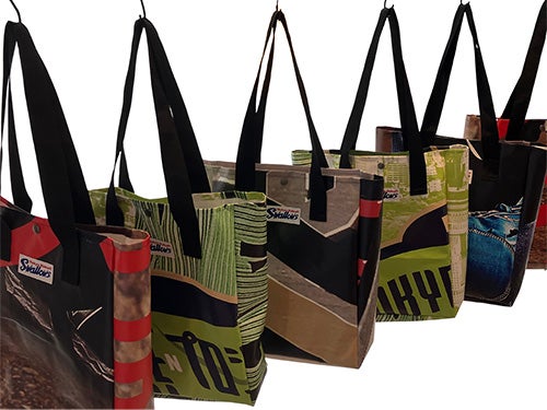 過去イベントで使用した懸垂幕(廃材)を使用したアップサイクルバッグとなります。