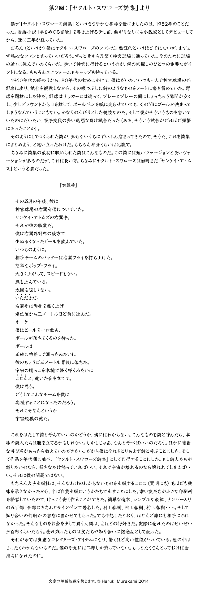 1979年小説家デビュー、『風の歌を聴け』で第23回群像新人賞を受賞。