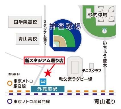 店舗紹介東京メトロ銀座線外苑前駅から神宮球場へとつながるスタジアム通りにある初の球団直営店舗です。