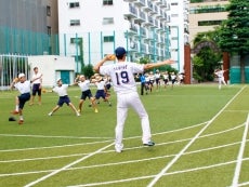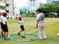 14日、元選手で現球団職員の山部太氏、河端龍氏が東京都港区にある区立青山小学校を訪問。現在行われている「新体力テスト」に向けて、児童たちへ正しいボールの投げ方を指導しました。