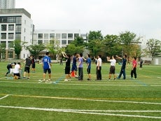 今回は第四回港区教育研究会体育部会の第二部・実技研修として、50名以上の先生方に向けて、児童への指導方法についての授業を実施しました。最初に、両氏が港南小学校の5年生に指導しているのを見学していただき、その後、先生方に児童と同じ動きを体験していただくとともに、児童に教える上でのコツなどを伝えました。