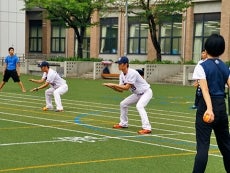 続いてキャッチボール。小学校は、低学年から高学年までで運動能力に差が出るため、児童の状況に合わせた4種類のキャッチボールの方法を指導。ゴロ、下投げ、上投げでワンバン、上投げでノーバン、と段階を付けることで、低学年から高学年まで幅広い運動能力に合わせることができます。さらに捕球の指導では、「足はパー、おしりを半分、せーの、パクッ!」と、楽しくかつ直観的に理解してもらえるような掛け声も指導しました。