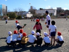 そしてボールの握り方や投げる際の身体の使い方を指導した後、いよいよキャッチボールの実践に移ります。しかしなかなか相手がいる方向にうまく投げることができない児童たち。そんな児童たちに対し、「ボールを持っていない方の腕は矢印みたいなものだからね。相手がいる方向にしっかり向けてから投げるといいよ」とアドバイスを送ります。