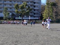 昨日までの雨模様が嘘のように晴れ渡ったこの日、1年生、2年生、3年生を対象に3度の授業を行いました。晴天ではあったものの強い北風で冷え込んでいたため、「寒いね!寒いから向こうのバスケットゴールをぐるっと回って帰ってこよう!」と河端氏を先頭に全員で走って身体を温めます。その後、両氏がさっそくキャッチボールのお手本を披露すると、「速い!」「ボール消えたよ?!」と児童たちは驚きの声をあげていました。
